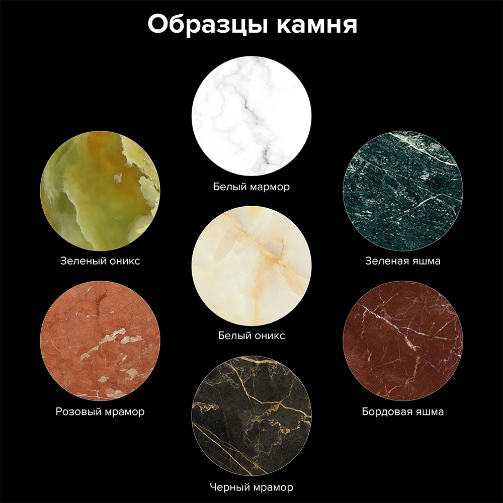 Возможно пять сортов камня (белый оникс, бордовая и зеленая яшма, черный и розовый мрамор)