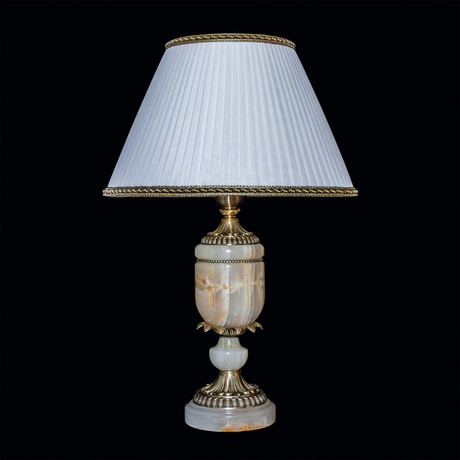 Основание – белый оникс, латунь. Абажур – ткань. Максимальная мощность лампы 100 Вт (Е 27).