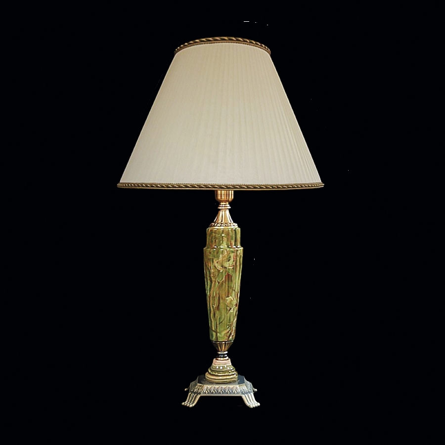 Основание – зеленый оникс, латунь. Абажур – ткань. Максимальная мощность лампы 100 Вт (Е 27).
