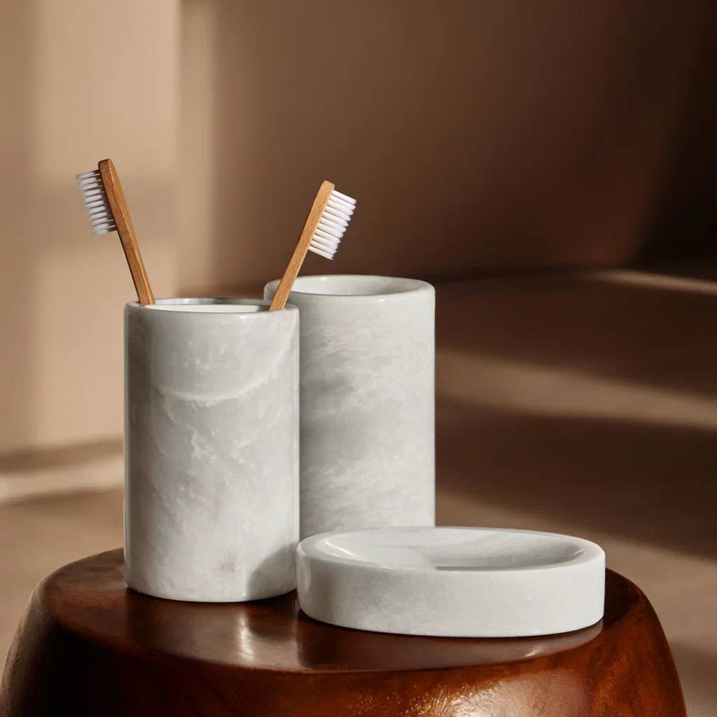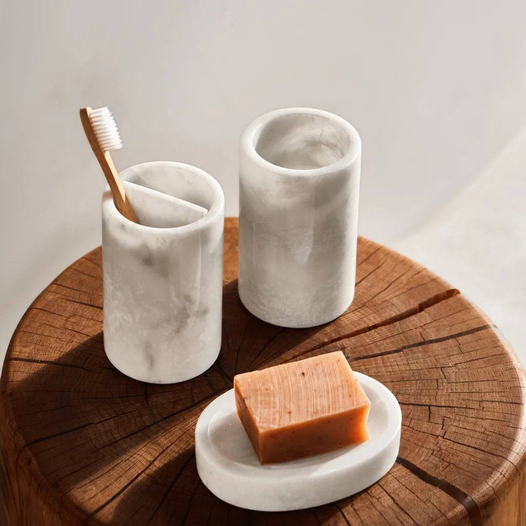 Набор аксессуаров для ванной из натурального мрамора станет изысканным дополнением к любому интерьеру. Этот элегантный набор, состоящий из стакана для щеток, стакана для зубной пасты и мыльницы, создан из высококачественного натурального мрамора Арабескато. Благодаря своей влагостойкости и ручному исполнению, этот набор не только украсит вашу ванную комнату, но и прослужит долгие годы. Мягкий белый цвет натурального мрамора привносит в пространство ощущение свежести и уюта, делая каждый день приятным и комфортным. Стильный комплект стаканов для щеток и пасты и мыльницы из мрамора с белым и светло-серым мраморным узором станет практичным дополнением ванной комнаты.